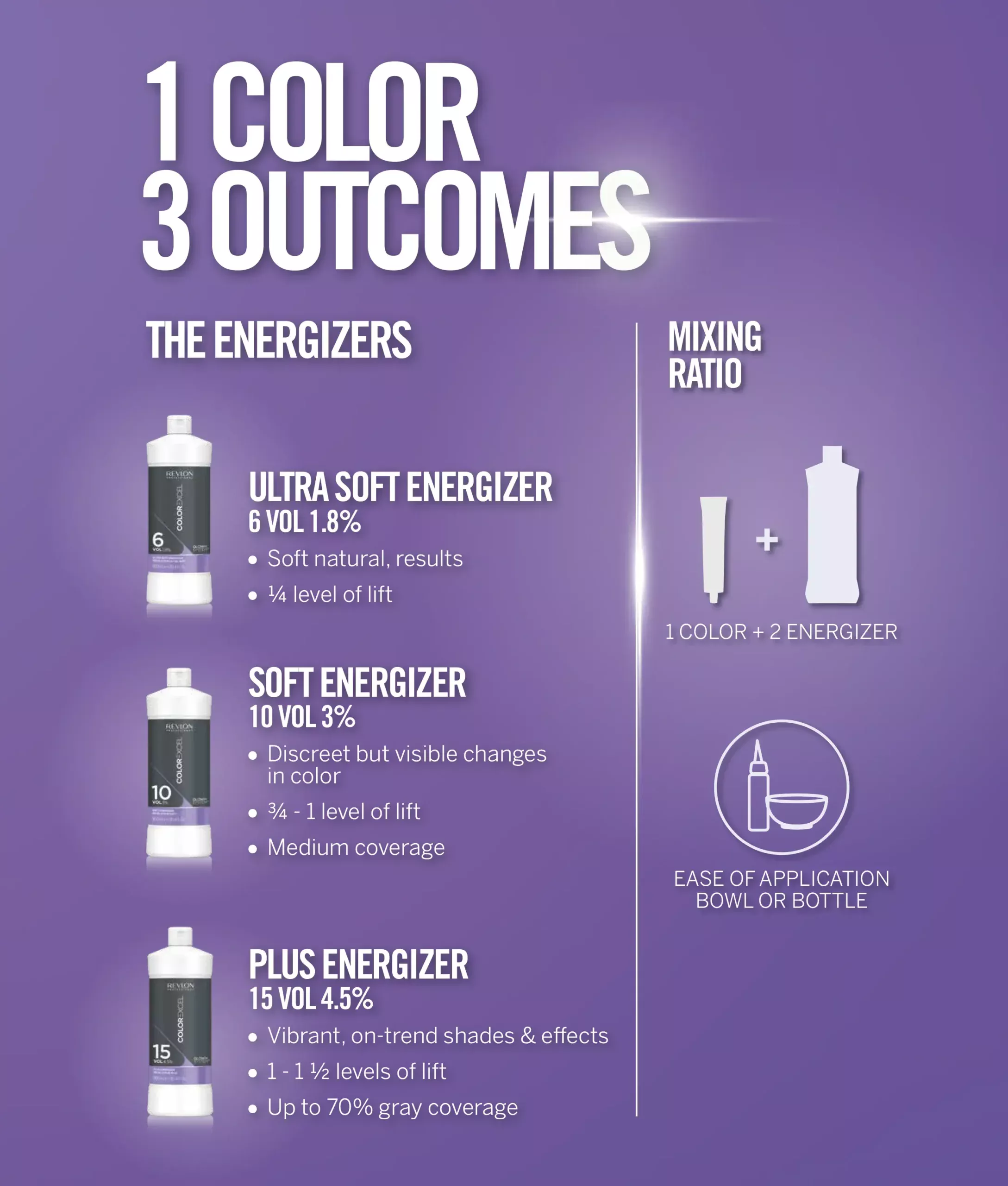Color Excel is our most gentle option when you need subtle, controlled lift with low peroxide to maintain maximum hair integrity. You can achieve exceptional uniformity when toning even the most challenging bases. There are 3 different energizers to choose from, so you can go further with your in-salon services by offering your clients personalized results.
