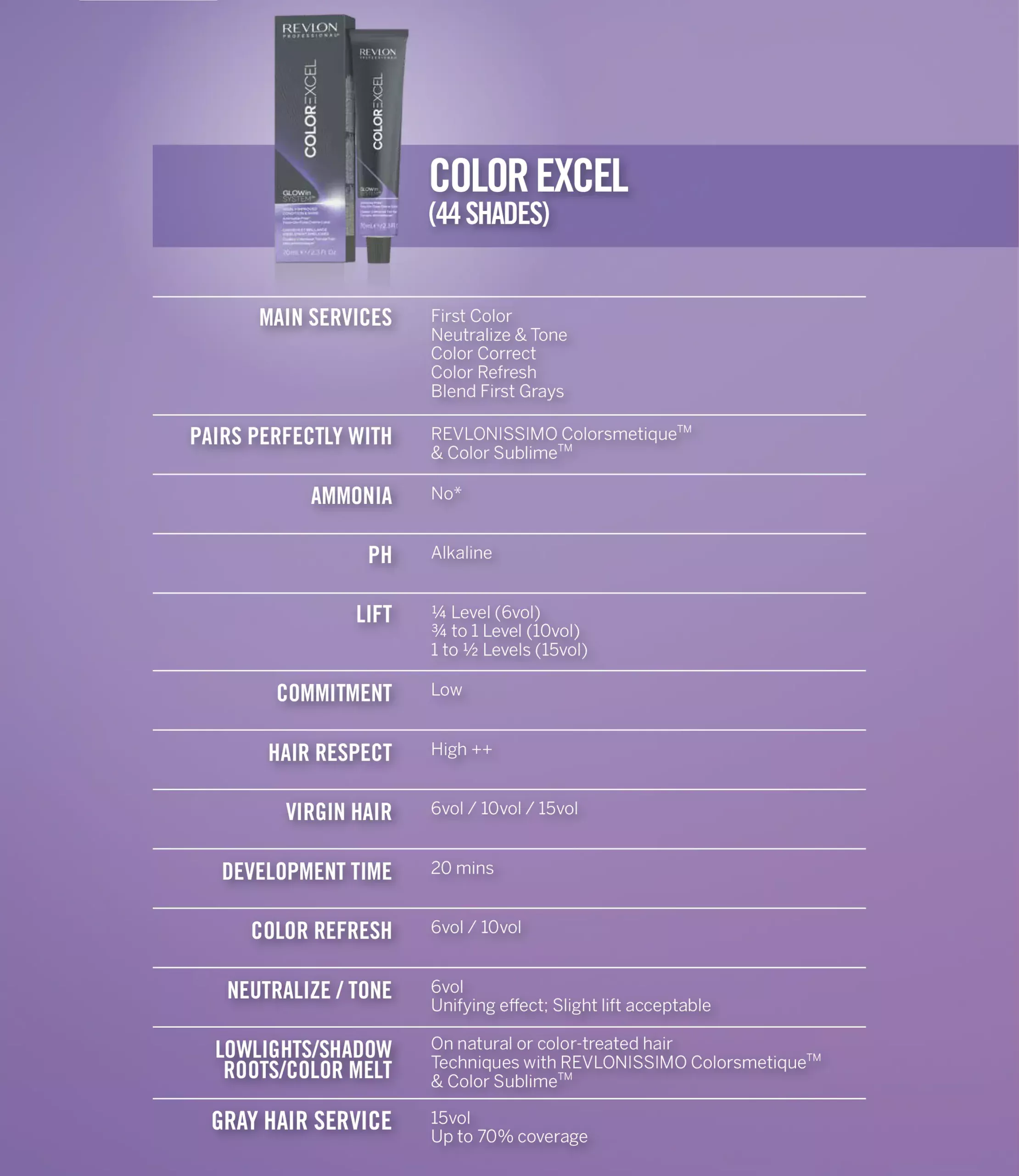 Color Excel is an ammonia-free formula with low-volume developers for maximum hair integrity. It delivers ultra-shiny results and improved hair condition. Perfect to refresh client color and revive shine with Revlonissimo Colorsmetique™ and Revlonissimo Color Sublime™ .