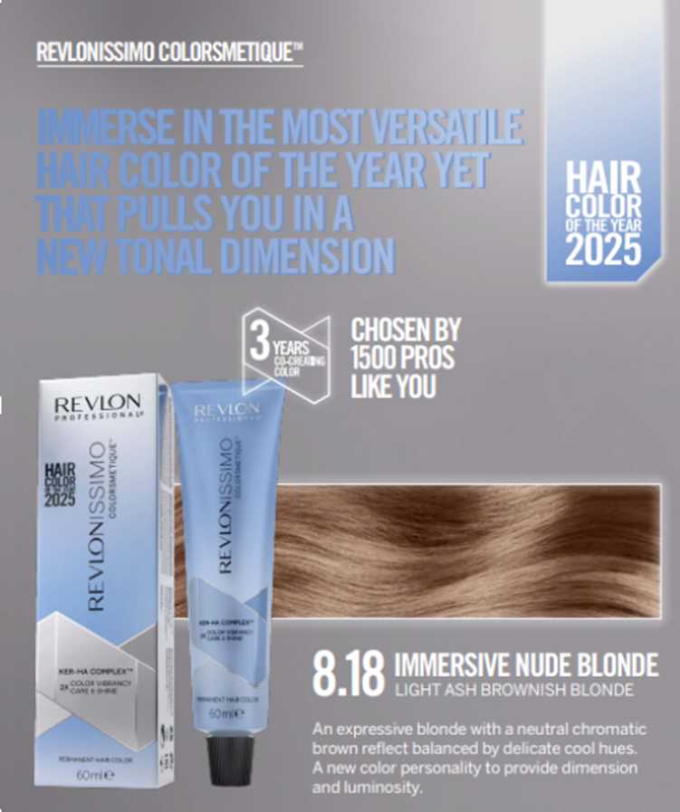 Take your client’s look to the next level with Revlon’s new 2025 Hair Color – 8.18 Immersive Nude Blonde – by customizing the shade to complement their unique style. Adjust the tone (whether cool, warm, or neutral) based on individual preferences and complexion to achieve a truly personalized result. Blend the color with the client’s natural base for a harmonious yet striking finish.