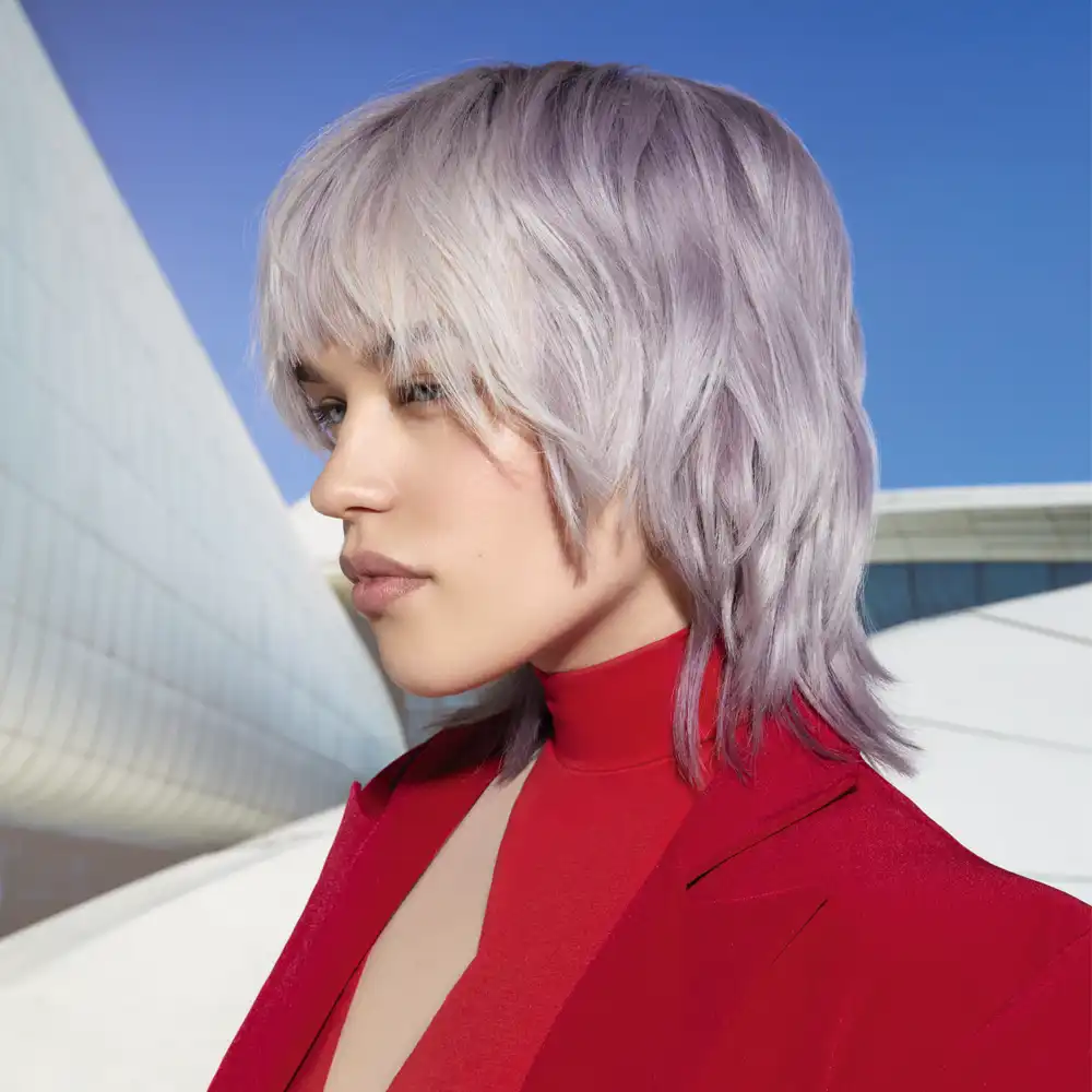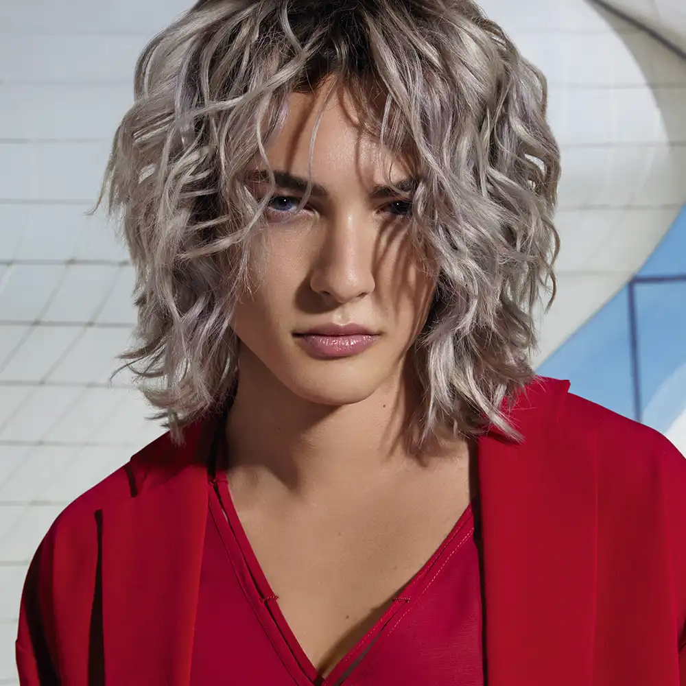 The faux bob cut is great for this look. To achieve texture and to enhance the wavy hairstyle, layer the hair without limits. Pre-lighten the hair to create a very light blonde. Then, apply the new Color Excel Gloss by Revlonissimo™ Diamond shade to tone the hair. The result is a futuristic and glamorous mane!