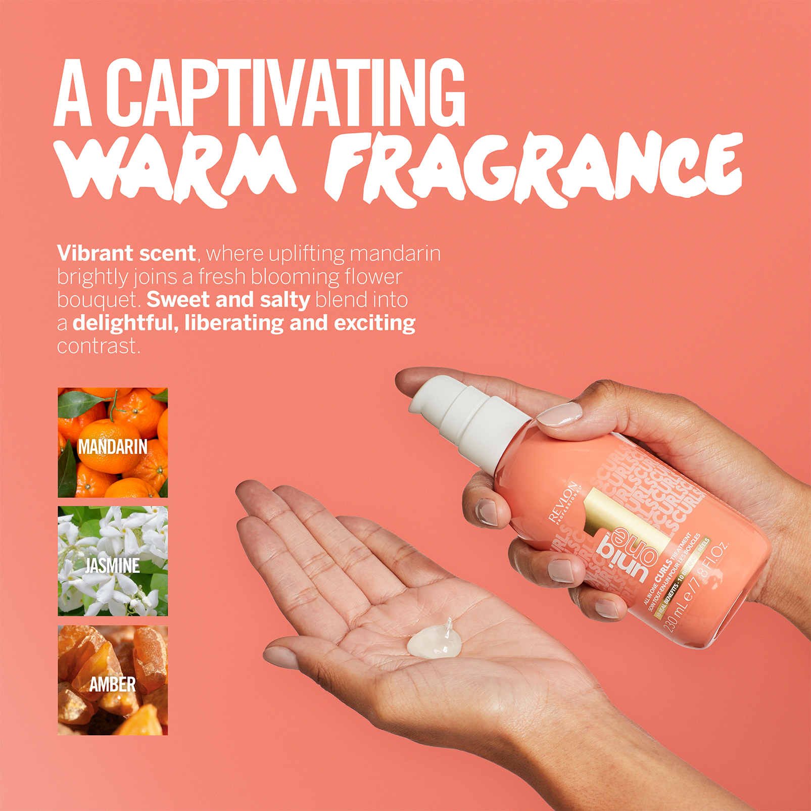 Verwöhnen Sie Ihre Sinne mit dem fesselnden, warmen Duft von UniqOne™ All In One Curls Treatment. Dieser lebendige Duft enthält belebende Mandarine, frisch blühende Blumen und eine köstliche Mischung aus süßen und salzigen Noten. Der warme Amber und die cremigen Hölzer schaffen eine sinnliche und einzigartige Atmosphäre.