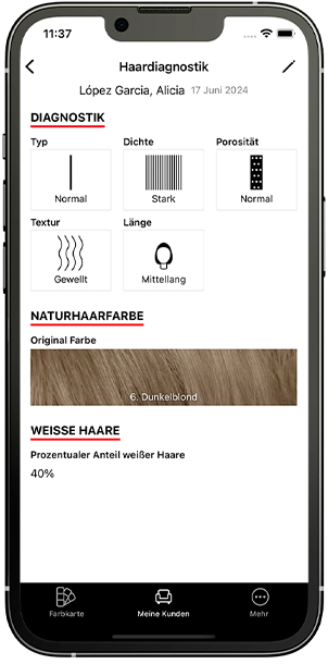 Diagnostizieren Sie Ihre Kunden und legen Sie ein Profil an: Bieten Sie Ihren Salonkunden ein personalisiertes Erlebnis. Diagnostizieren Sie ihr Haar, speichern Sie ihre Profile und bieten Sie maßgeschneiderte Lösungen für ihre Haarbedürfnisse.