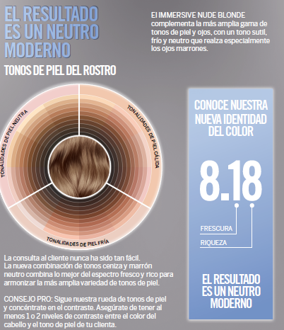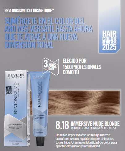 Lleva el look de tu cliente al siguiente nivel con el nuevo Hair Color 2025 de Revlon – 8.18 Immersive Nude Blonde – personalizando el tono para complementar su estilo único. Ajusta el matiz (ya sea frío, cálido o neutro) según sus preferencias individuales y su complexión para lograr un resultado verdaderamente personalizado. Mezcla el color con la base natural del cabello del cliente para un acabado armonioso pero impactante.
