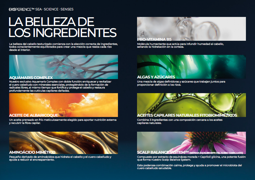 - ALGAE & SUGARS: Una mezcla de algas y azúcares que trabajan en conjunto para proporcionar una mayor definición a los rizos.