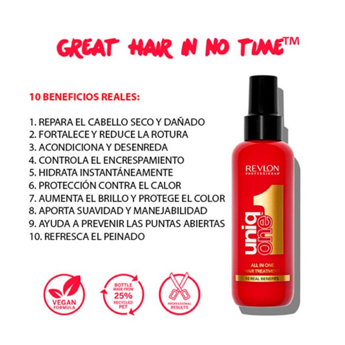 - Tratamiento UniqOne™: Ofrece 10 beneficios reales, aptos para todo tipo de cabello.