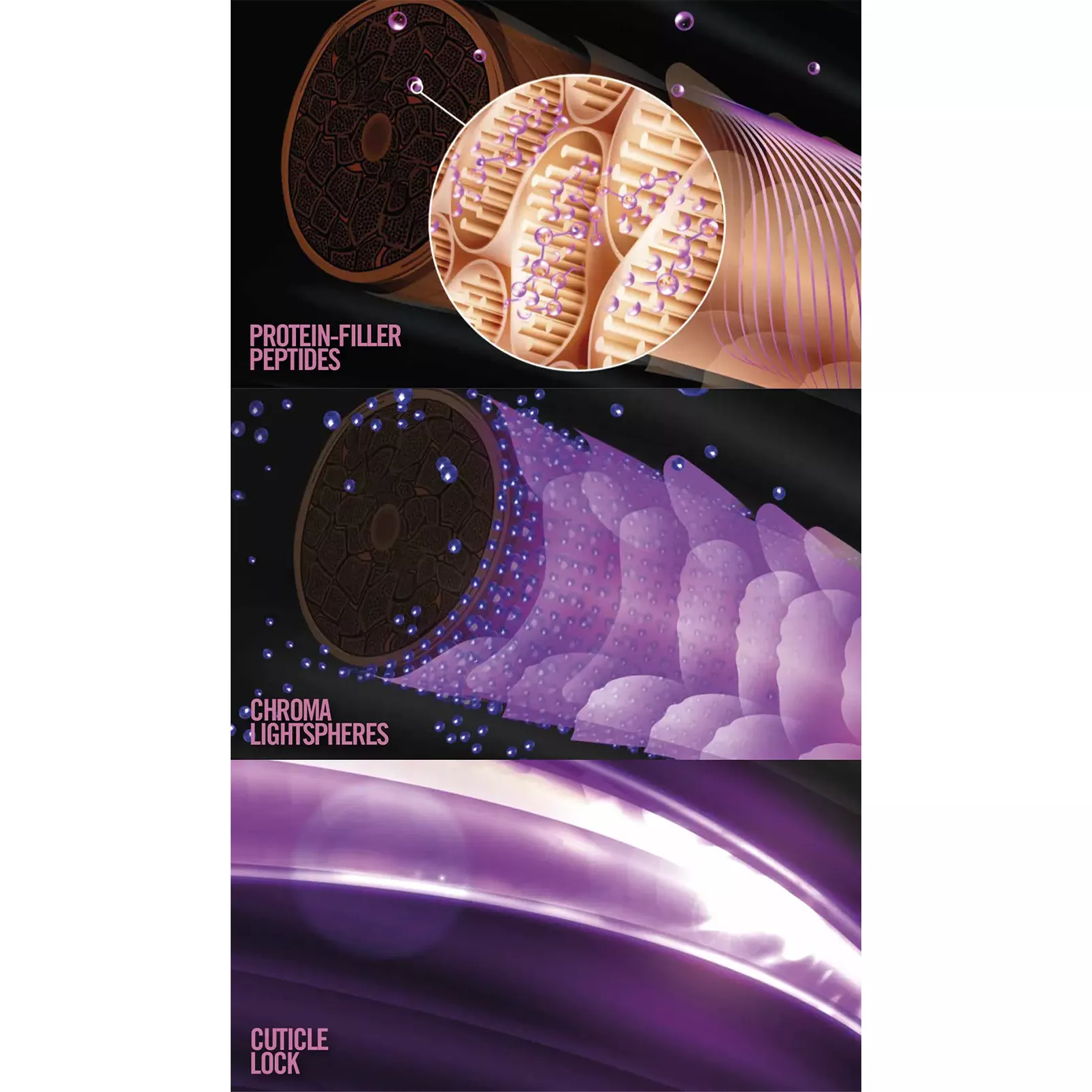Las Chroma Lightspheres depositan pigmentos altamente reflectantes 1.000 veces más pequeños que la fibra capilar para una difusión óptima del pigmento dentro de la estructura del cabello. Crean un efecto de resplandor desde dentro y el bloqueo de la cutícula lo sella para un acabado alisador de la superficie que produce la máxima reflexión de la luz.
