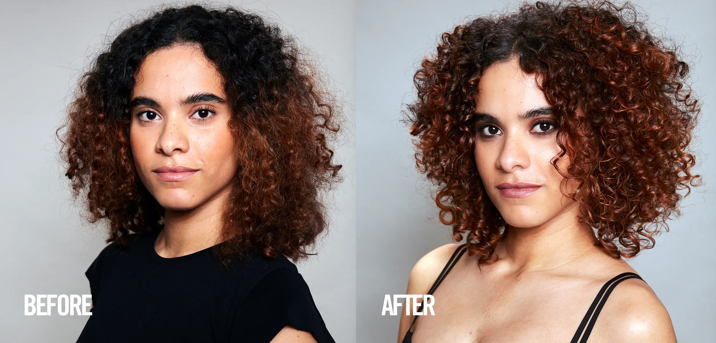 - Programa retoques periódicos para refrescar el color . Un esmalte con Color Excel cada 4 semanas a 3 meses puede mantener el mejor aspecto del cabello rizado y conservar el color deseado. Para nuestro modelo, utilizamos 8.342, que es un impresionante tono bronce que trata, colorea y agrega brillo en la mitad de tiempo.