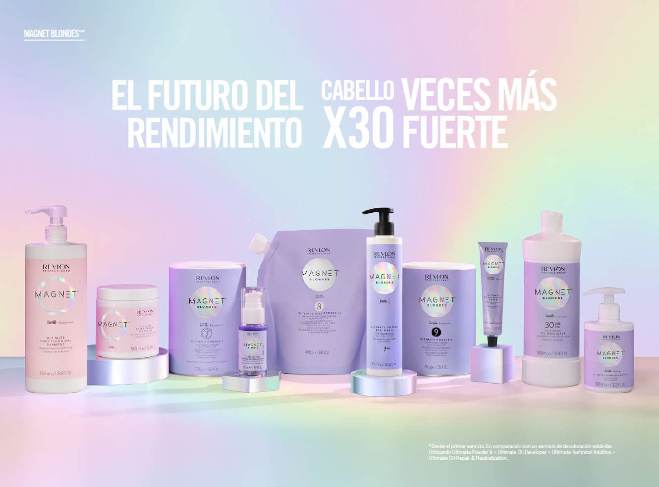 - El paso 1 comienza con todos los polvos de aclarado (Magnet™ Blondes Ultimate Powder 9, Magnet™ Blondes Ultimate Powder 7, Magnet™ Blondes Ultimate Clay Powder 8, y Magnet™ Blondes Ultimate Crema Aclarante Suave) mezclados con Magnet™ Blondes Ultimate Oxidante con aceite y el Tratamiento de Bonding y Fortalecimiento del Cabello con color Magnet™ Blondes, logrando hasta 9 niveles de aclaración mientras protege proactivamente la estructura interna del cabello.