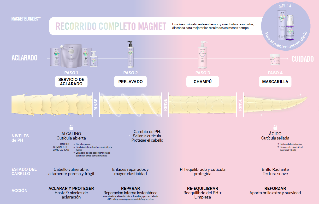Magnet™ ofrece un sistema integral de principio a fin que respalda a los estilistas en cada fase del servicio de salón. Desde la preservación de la integridad de los enlaces hasta la neutralización de agresores externos, Magnet™ proporciona soluciones específicas en cada etapa del servicio en el salón:
