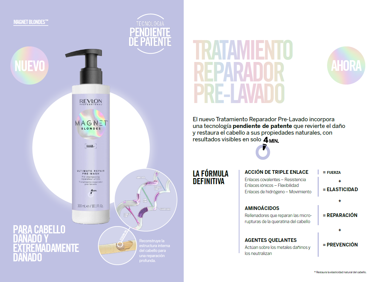 Revlon Professional® Magnet™ Blondes Ultimate Repair Pre-Wash redefine el estándar del cuidado en salón. Mientras que la decoloración suele ser el punto de partida en los servicios de aclarado, esta fórmula innovadora representa una etapa transformadora por sí sola. Diseñada con tecnología en proceso de patente, Magnet™ Blondes Ultimate Repair Pre-Wash penetra profundamente en la estructura interna del cabello para restaurar su flexibilidad y movimiento natural, ofreciendo resultados visibles en solo 4 minutos. En lugar de ocultar el daño existente, lo revierte, sentando las bases para una salud capilar duradera.