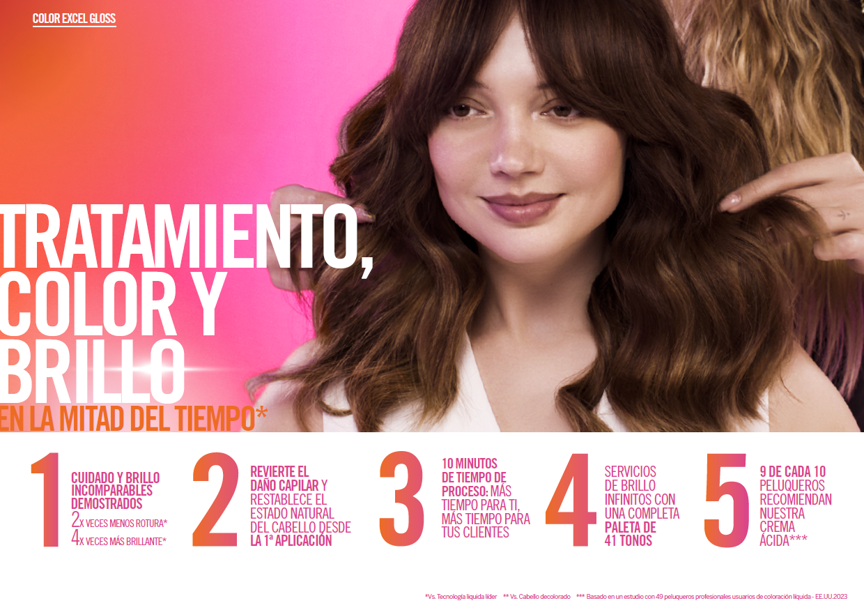 El Servicio Radiant Glow está impulsado por una tecnología ácida que respeta la estructura del cabello en cada fase del proceso de coloración. Un pH ácido devuelve el cabello a su estado óptimo después de la coloración, reduciendo la porosidad, suavizando la cutícula y restaurando el brillo. En lugar de levantar y dañar, Color Excel Gloss revierte el daño causado por procesos químicos y reconstruye la estructura para recuperar la calidad natural del cabello desde la primera aplicación.