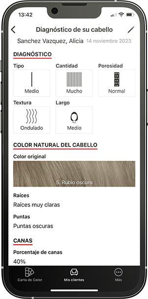 - Diagnostica y perfila a tus clientes: Ofrece una experiencia personalizada a los clientes de tu salón. Diagnostica su cabello, guarda sus perfiles y ofrece soluciones a medida para satisfacer sus necesidades capilares.