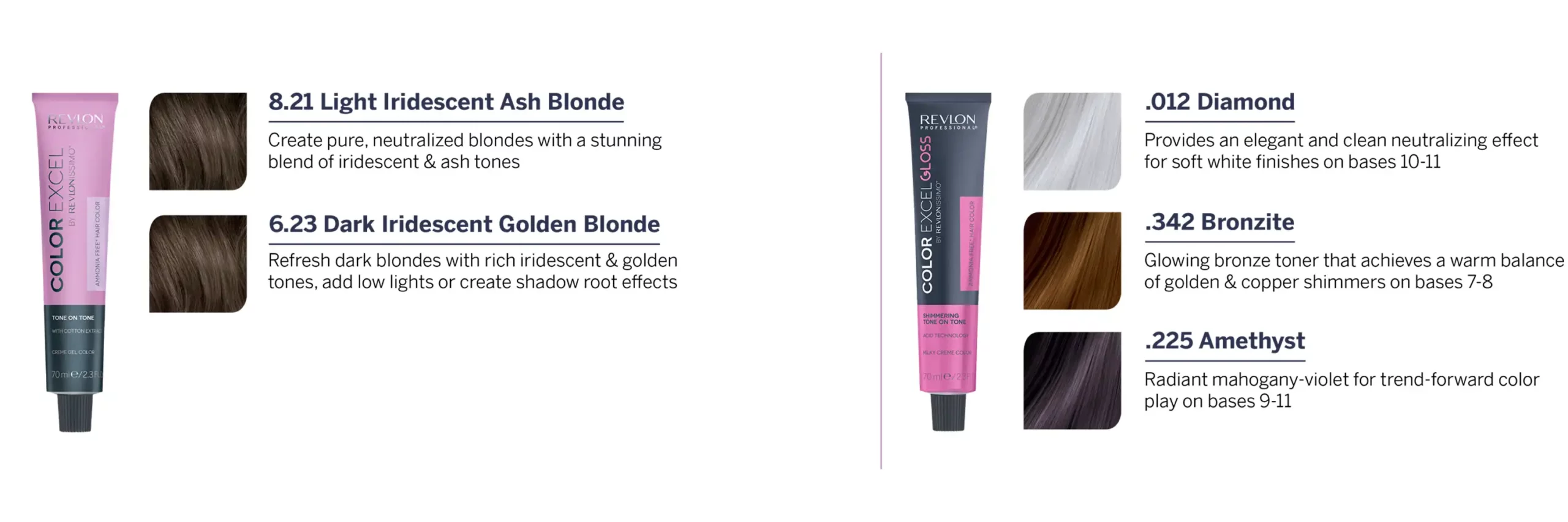 Vi presentiamo le nuove nuances tono su tono di Color Excel e Color Excel gloss GEMS/TONES, ispirate alle più lucenti pietre preziose. I professionisti possono utilizzare questa nuova gamma di nuances per aggiungere sorprendenti riflessi di luce e creare colori ricchi e traslucidi per far brillare i capelli. Queste nuances richiedono basso impegno e sono personalizzabili grazie agli infiniti riflessi multi-sfaccettati che potrai creare.. Scopri le nuances di Color Excel! Troviamo l’ 8.21 Biondo Cenere Chiaro Iridescente e il 6.23 Biondo Scuro Dorato Iridescente. Poi abbiamo Color Excel Gloss con il .012 Diamond, .342 Bronzite e .225 Ametista, per un colore straordinario e scintillante.